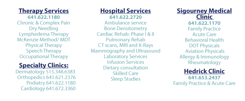 If you have any questions or you would like to make an appointment with one of our visiting specialists you or your primary care provider can call 641-622-1180.